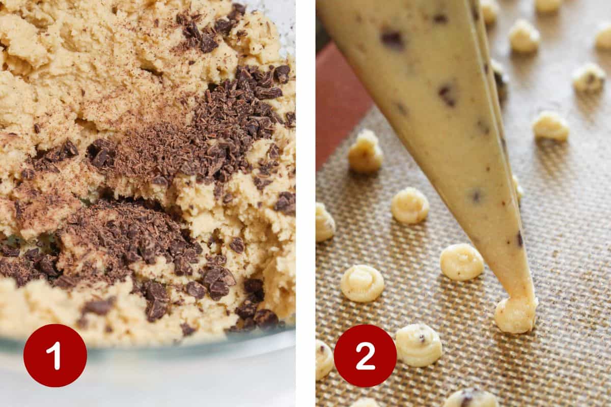 - Scoop dough into a piping bag and cut a small triangle from bottom of the bag. Begin piping small cookies onto the lined cookie sheet in long lines. We want the cookies to be smaller than dimes. Continue to pipe until your cookie sheet is full, leaving a small space between each cookie.