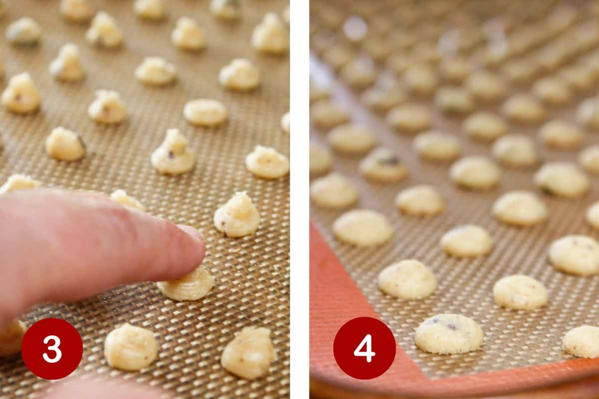 - Put the dough into a piping bag {a Ziploc bag might work but a piping bag is stronger}. Cut a small triangle from the bottom of the bag. Begin piping small dots of dough onto a silicone mat {or parchment} lined baking sheet. The mounds of dough will be SUPER small. In fact, you should be able to fit a lot of cookies on one sheet.