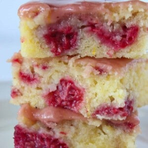 Sometimes I want a lemon dessert and nothing else will do. That is especially true as the weather gets warmer. For some reason lemon just seems so refreshing when it is hot outside. I have other lemon recipes on the site but these Raspberry Lemonade Bars might just be the best lemon recipe yet! A soft and brownie like lemon bar with fresh raspberries sprinkled inside, with a layer of delicious glaze, these babies are awesome with a capital A! Keep scrolling to see how you can make them.