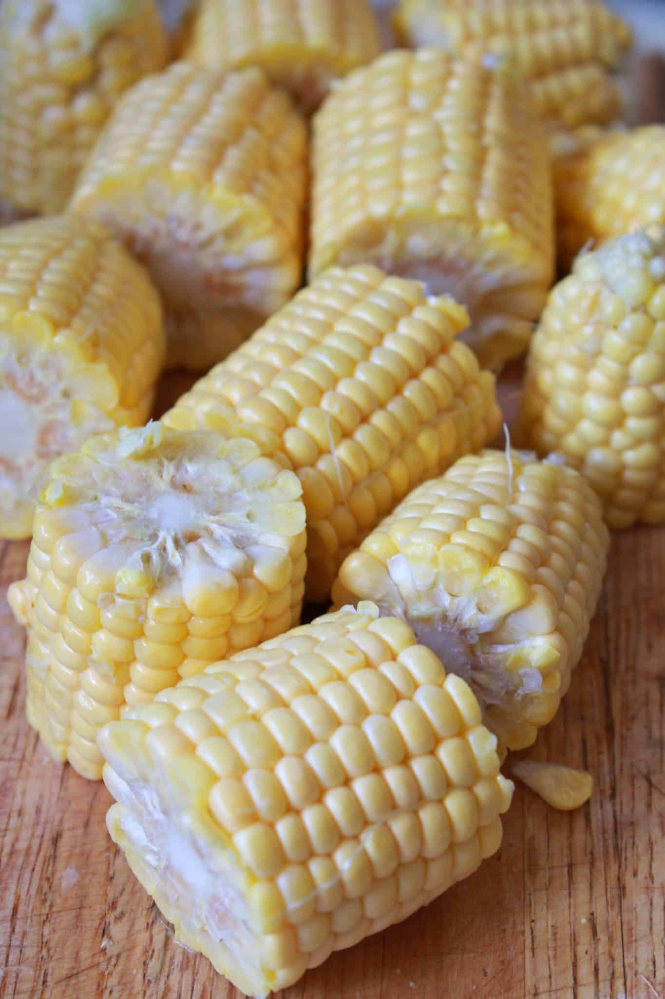 - We are going to do the same thing with the corn on the cob. Cut each cob into four pieces.