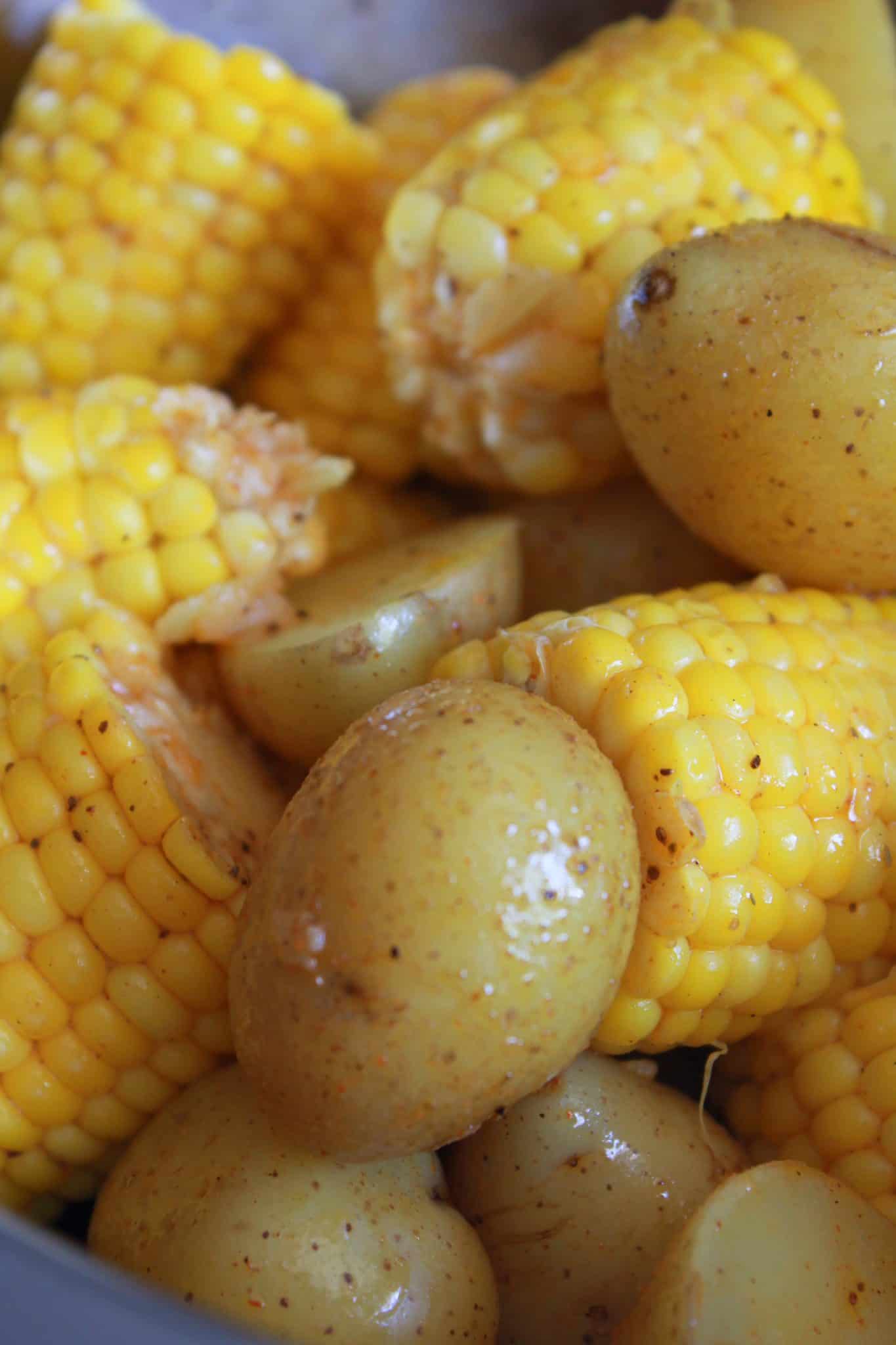 - Pour about half of the butter mixture on the par cooked potatoes and corn on the cob. Mix until evenly coated.