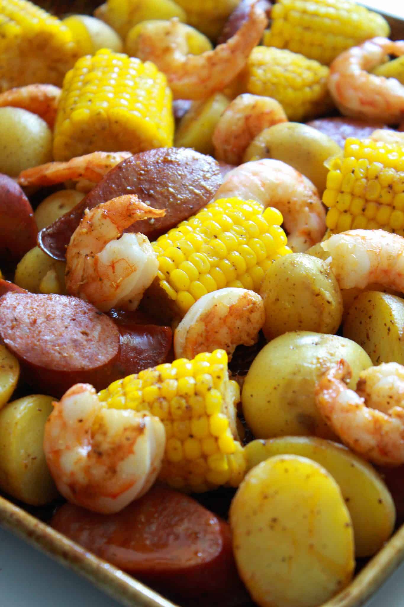 A sheet pan full of corn on the cob, baby potatoes, andouille sausage and of course shrimp is covered in a spicy lemon butter mixture and baked to perfection.